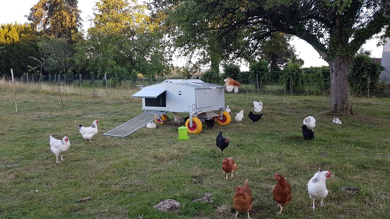Nous élevons, en plein air intégral, 30 poules pondeuses que nous déplaçons sur la ferme.